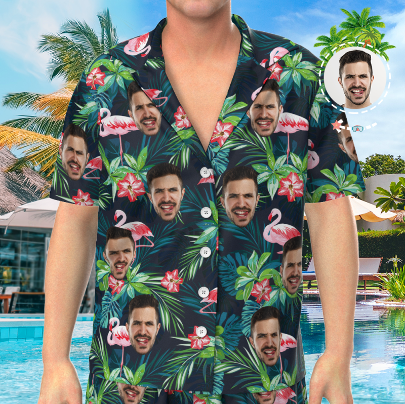 Conjunto De Pijama Personalizado Con Cara, Ropa De Dormir De Manga Corta, Ropa De Dormir Con Botones - Hojas y Flamenco