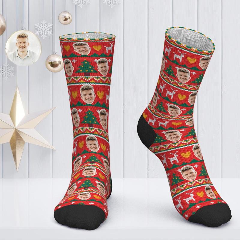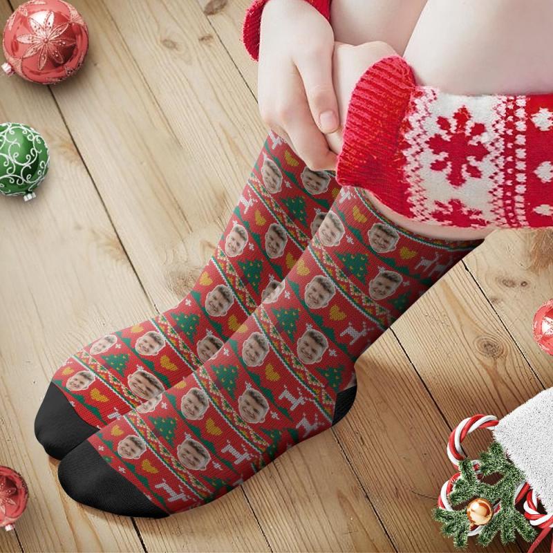 Calcetines faciales personalizados Calcetines personalizados con foto Regalo de Navidad Calcetines de Papá Noel Árbol de Navidad - Rojo