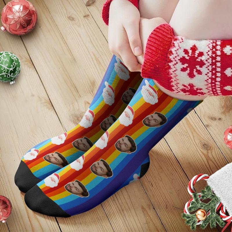 Calcetines faciales personalizados Calcetines personalizados con foto Regalo de Navidad Calcetines de Papá Noel - Papá Noel y arco iris