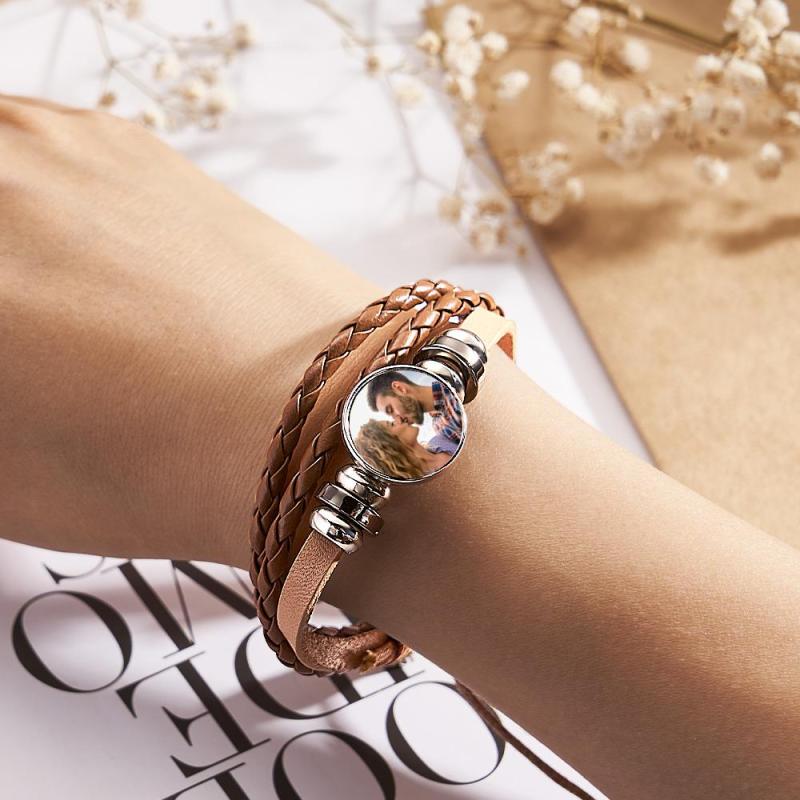 Esta moderna y divertida pulsera de cuero presenta un diseño único de botón a presión que seguramente te hará destacar entre la multitud. El botón a presión se puede personalizar con sus fotos favoritas, lo que lo convierte en un accesorio único. Moderna y elegante, esta pulsera es la manera perfecta de expresar tu estilo.