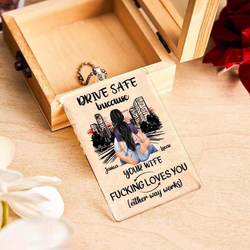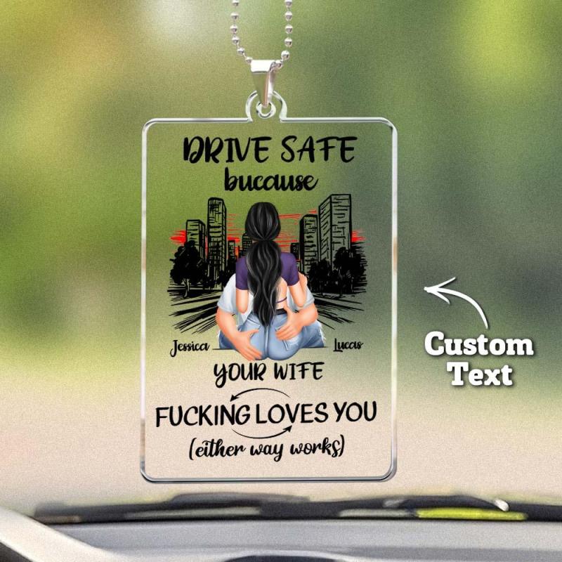 Agrega un toque de humor y amor a tu auto con nuestro adorno para auto personalizado 'Drive Safe Because Your Wife Fucking Loves You'. Esta decoración para auto única y atrevida es el regalo perfecto para aniversarios, San Valentín, cumpleaños, Navidad o cualquier ocasión especial. Ideal para esposos y novios, sirve como un recordatorio constante de su amor y cariño.